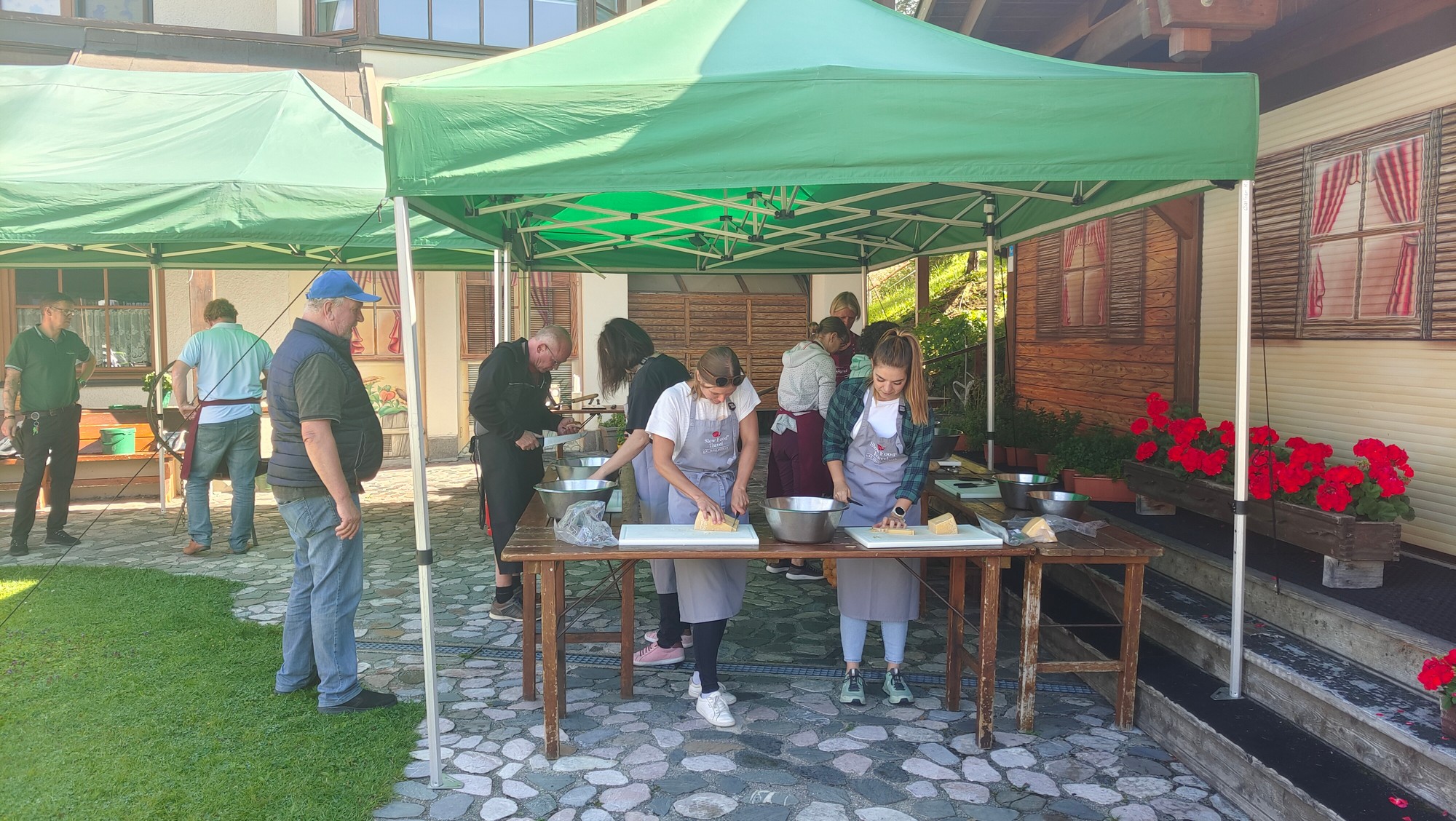 Die Vorfreude der Kursteilnehmer steigt bereits beim Vorbereiten der Zutaten, denn diese sind von höchster Qualität und direkt aus der Gailtaler Region. Steigt einem der Geruch von würzigem Almkäse oder geräuchertem Speck erstmals in die Nase, möchte man gerne einmal verstohlen ein Stückchen naschen. Herr Plattner stellt wohlweislich ausreichende Mengen der Produkte zur Verfügung, deshalb kann man sich ruhigen Gewissens ein Stückchen im Munde zergehen lassen.