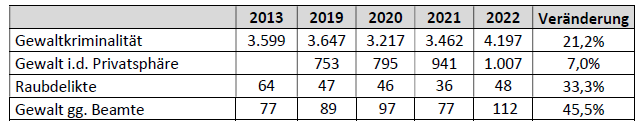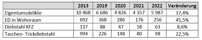 Die Zahl der Anzeigen ist 2022 im Vergleich zum Vorjahr um 16,9 Prozent auf 24.546 Anzeigen angestiegen (2021: 21.004). Damit liegt die Gesamtkriminalität knapp über dem Niveau von 2019, also der Zeit vor der Corona-Pandemie (2019: 24.286). Im Zehnjahresvergleich ist jedoch trotzdem ein Rückgang zu erkennen, 2013 wurden 27.888 Delikte zur Anzeige gebracht.