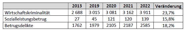 Die Wirtschaftskriminalität ist 2022 angestiegen und weist zugleich den höchsten Wert der letzten zehn Jahre auf. Der Großteil der Fälle entfiel auf Betrugsdelikte.