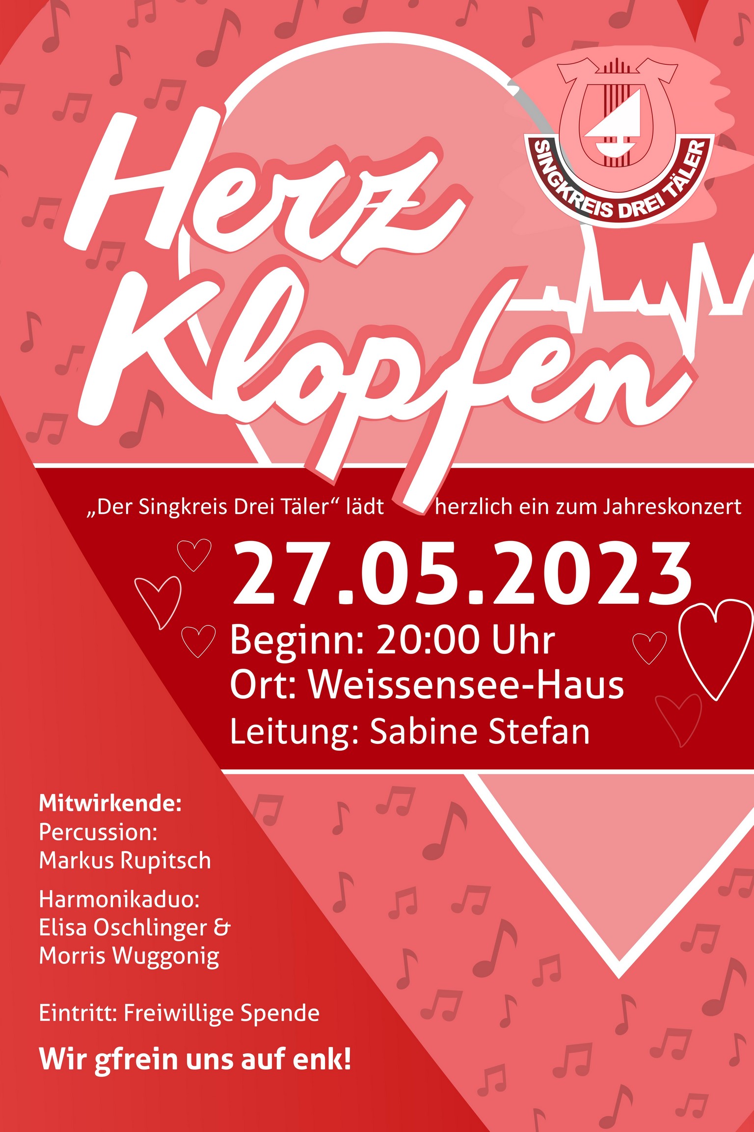 Unter dem Motto „Herzklopfen“ laden die Sängerinnen und Sänger des Singkreis „Drei Täler“ am Samstag, 27.05.2023 zu ihrem Konzertabend im Weissensee-Haus herzlich ein.