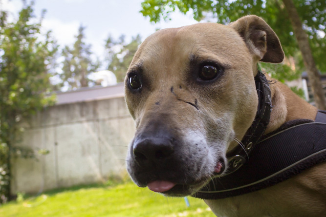 Aufgrund meiner Vorgeschichte bin ich ziemlich schüchtern und ängstlich, obwohl ich Menschen sehr gerne hab. Trotzdem ist es wohl besser, wenn ich in der Öffentlichkeit einen Maulkorb trage und mit Katzen und Kindern nichts zu tun habe.
