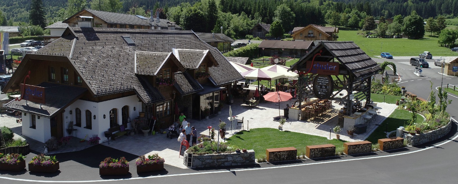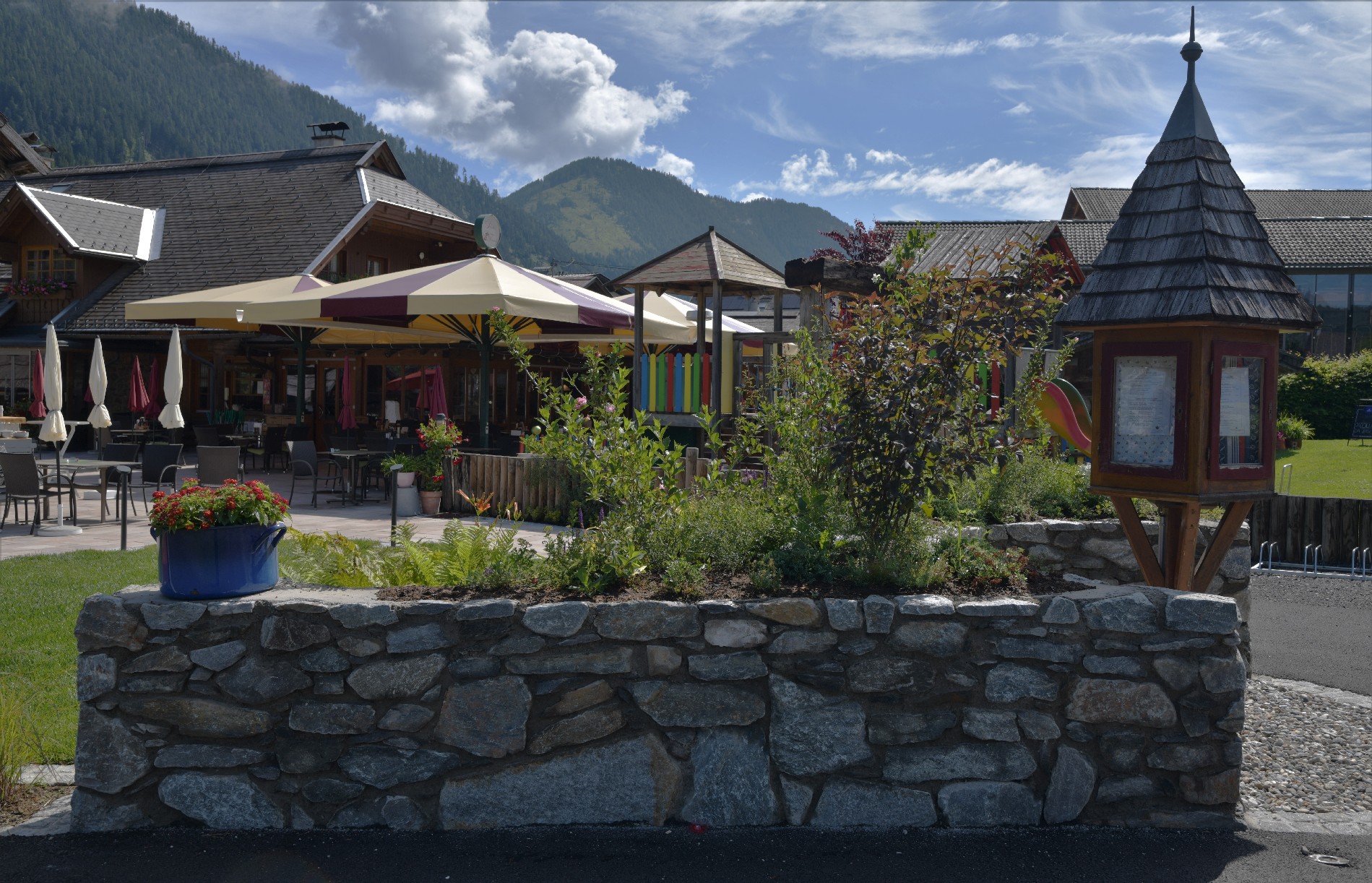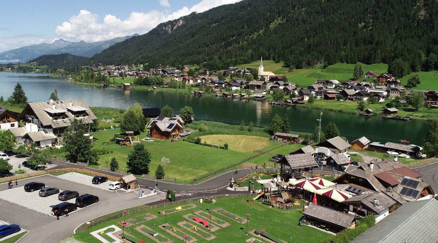 Der neue Außenbereich zeigt sich heute einladen und in einer Einheit mit der umliegenden Umgebung des Naturparks Weissensee.