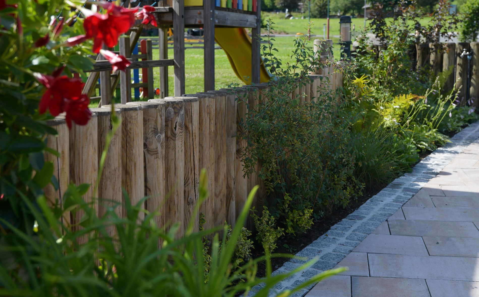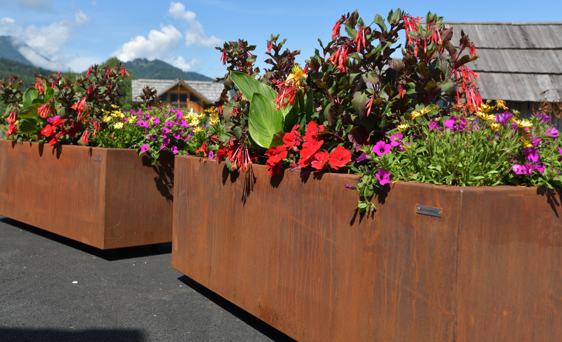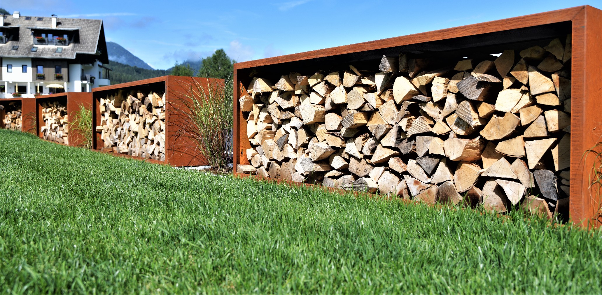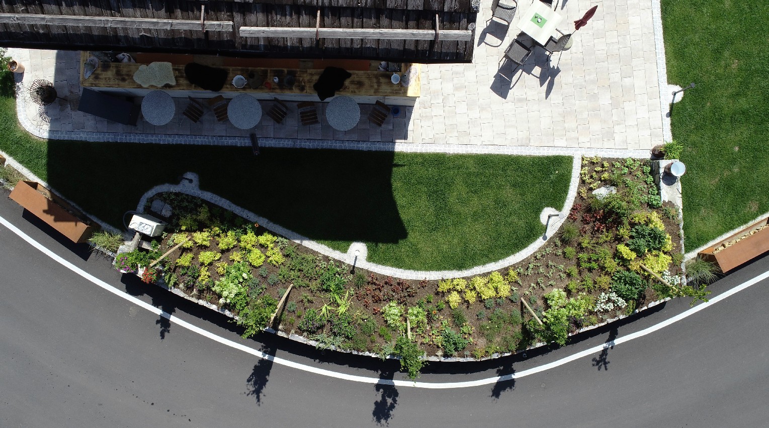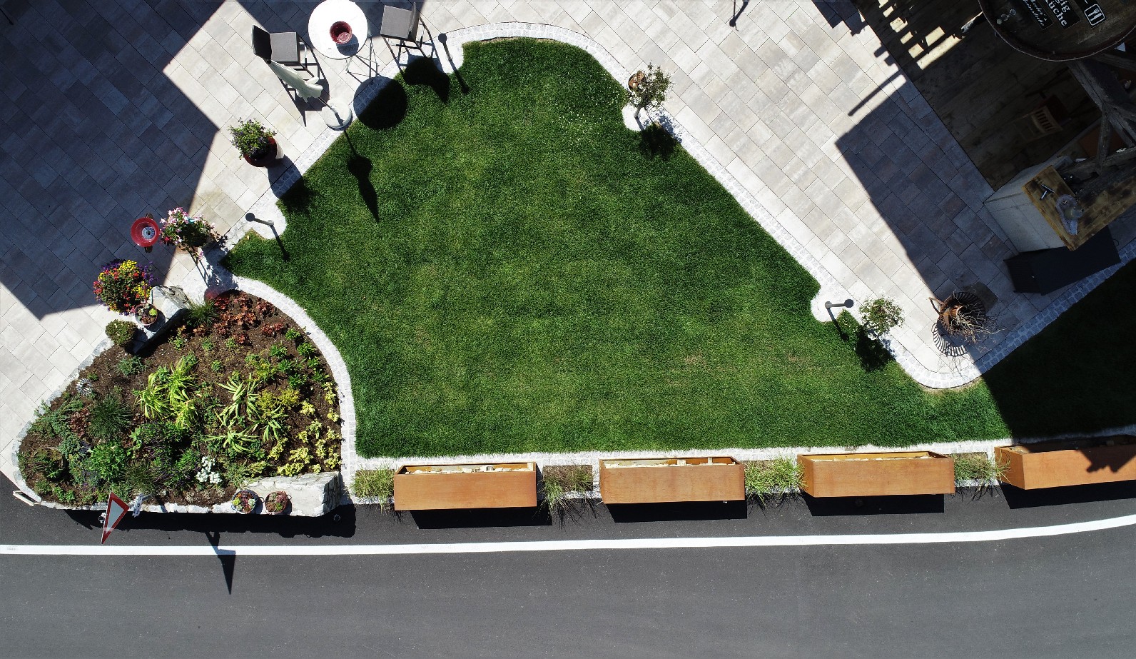 Dabei verschönern Pflanztöpfe aus Cortenstahl, Rollrasen und unterschiedliche Bepflanzungen die neu angelegte Außenanlage.