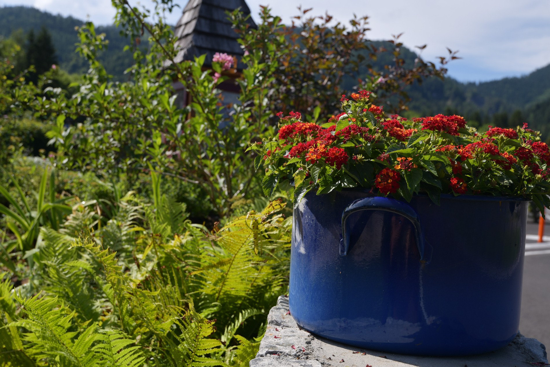 Das ehemals von der Straße abgetrennte Nebengebäude, eine alte Holzkese bietet den Lokalbesuchern/-innen heute einen urigen Schatten- oder Regenschutzplatz.