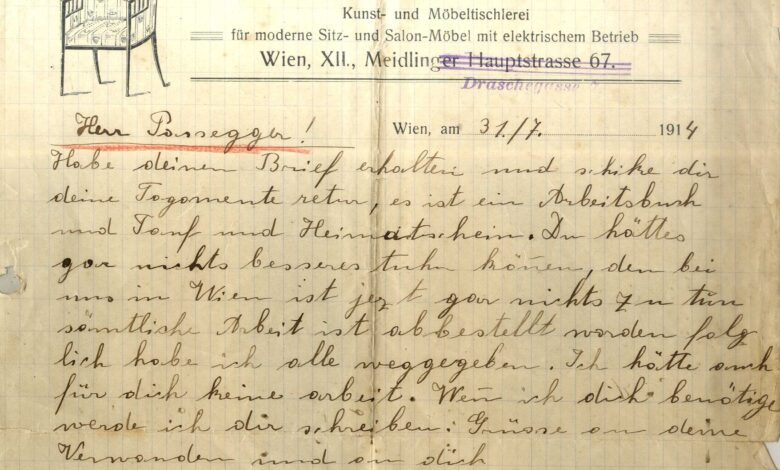 Der Brief datiert vom 31. Juli 1914 – drei Tage vorher hat Österreich-Ungarn Serbien den Krieg erklärt und der erste Weltkrieg begann.