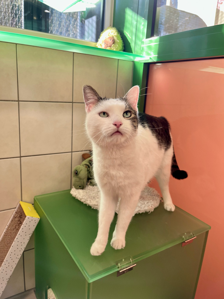 Die Tierpfleger:innen bei TiKo meinen: Ich bin sehr verschmust und anhänglich, habe leider „Forl“, weswegen ich häufigere Tierarzt-Besuche vor mir habe. Ich suche ein liebevolles Zuhause.