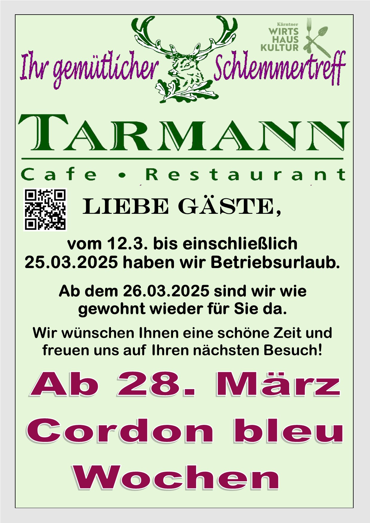 Betriebsurlaub bei Cafe & Restaurant Tarmann